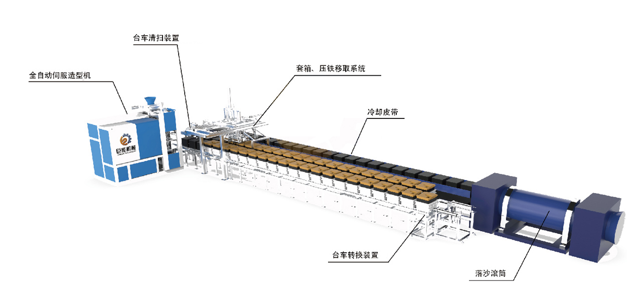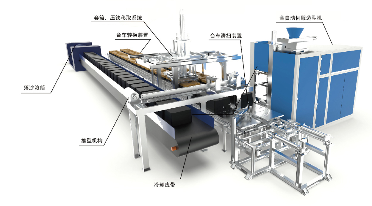 采用氣動(dòng)推動(dòng)、氣液緩沖、水平循環(huán)、臺(tái)車步進(jìn)移動(dòng)轉(zhuǎn)換、造型自動(dòng)線由自動(dòng)造型機(jī)、砂型轉(zhuǎn)換機(jī)構(gòu)、套箱壓轉(zhuǎn)換機(jī)械、砂型推動(dòng)機(jī)構(gòu)、臺(tái)車輸送軌道、套箱、壓鐵電機(jī)控制箱等組成。